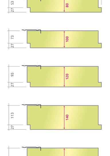 Panely systému ISOTEC Linea se vyrábějí v délce 3.000 mm, šířce 342 mm (jiné šířky na doptání) a v tloušťce 80, 100, 120, 140 a 160 mm.
